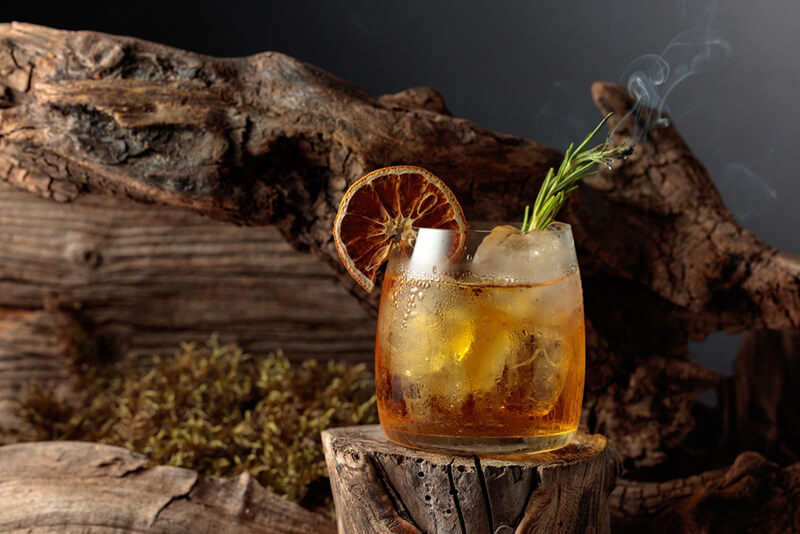 An old-fashioned cocktail over ice on an old wooden stump